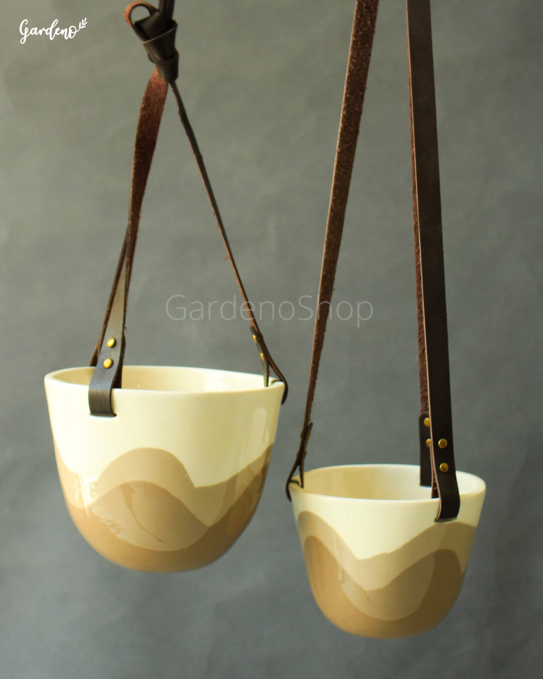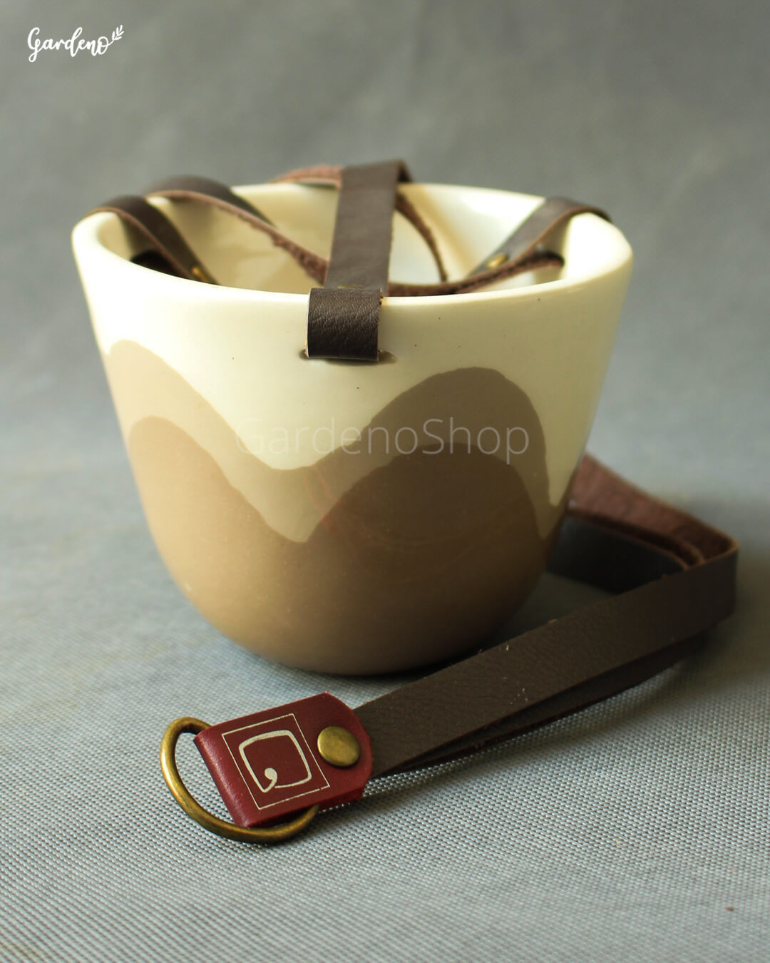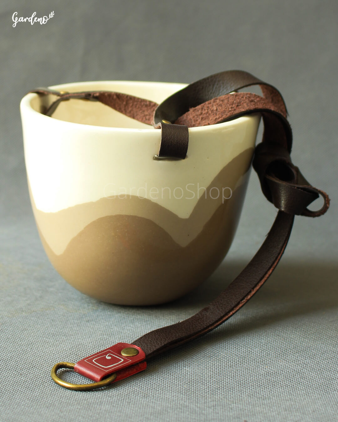 گلدانهای آویز سرامیکی دارای بند چرم است که مقاومت بالایی از خود نشان میدهد و شما میتوانید به راحتی گیاه خودتان را داخل آن بکارید. بند چرم در ارتفاع ۵۰-۵۵ سانتیمتر از لبه گلدان تا قسمت آویز است.