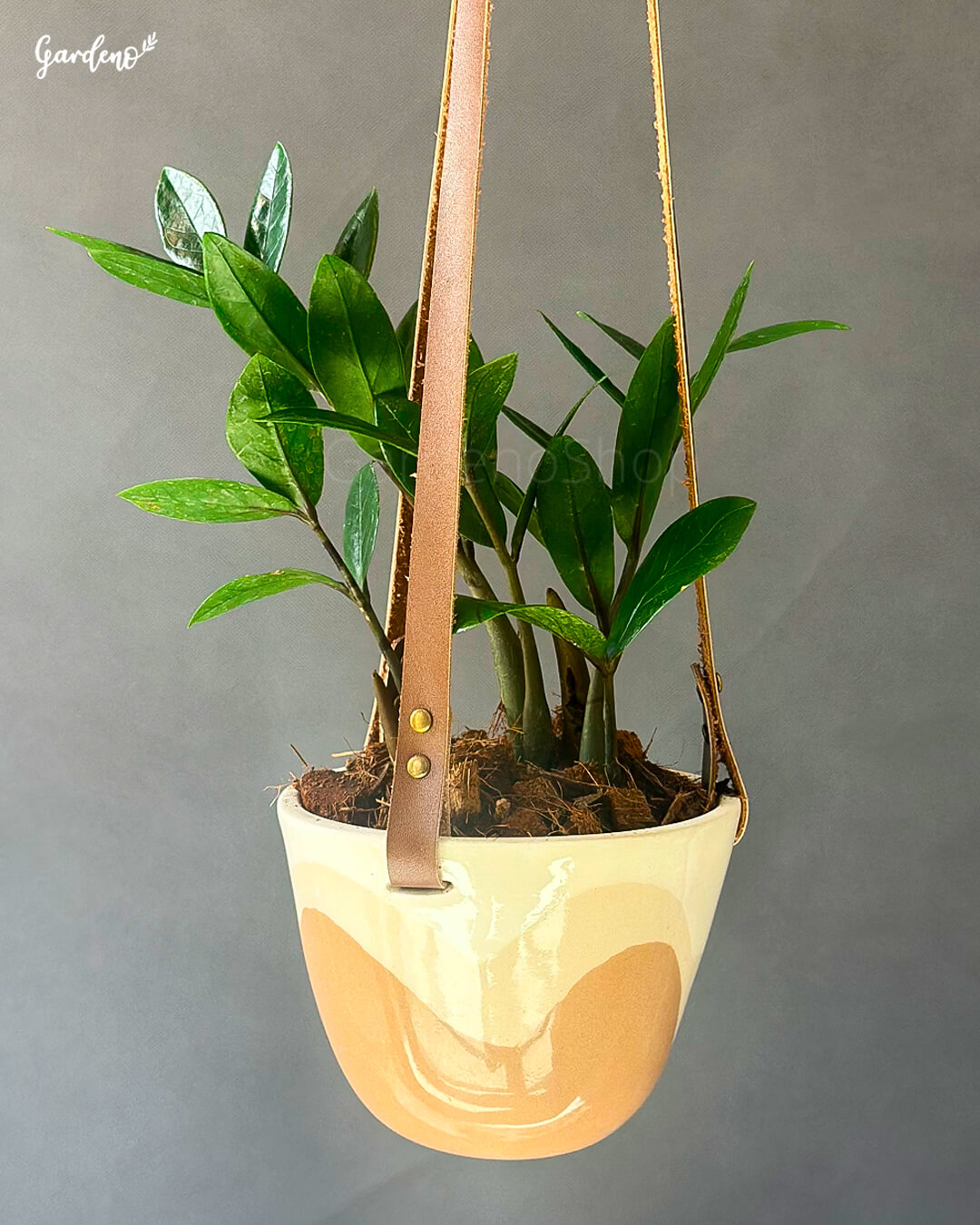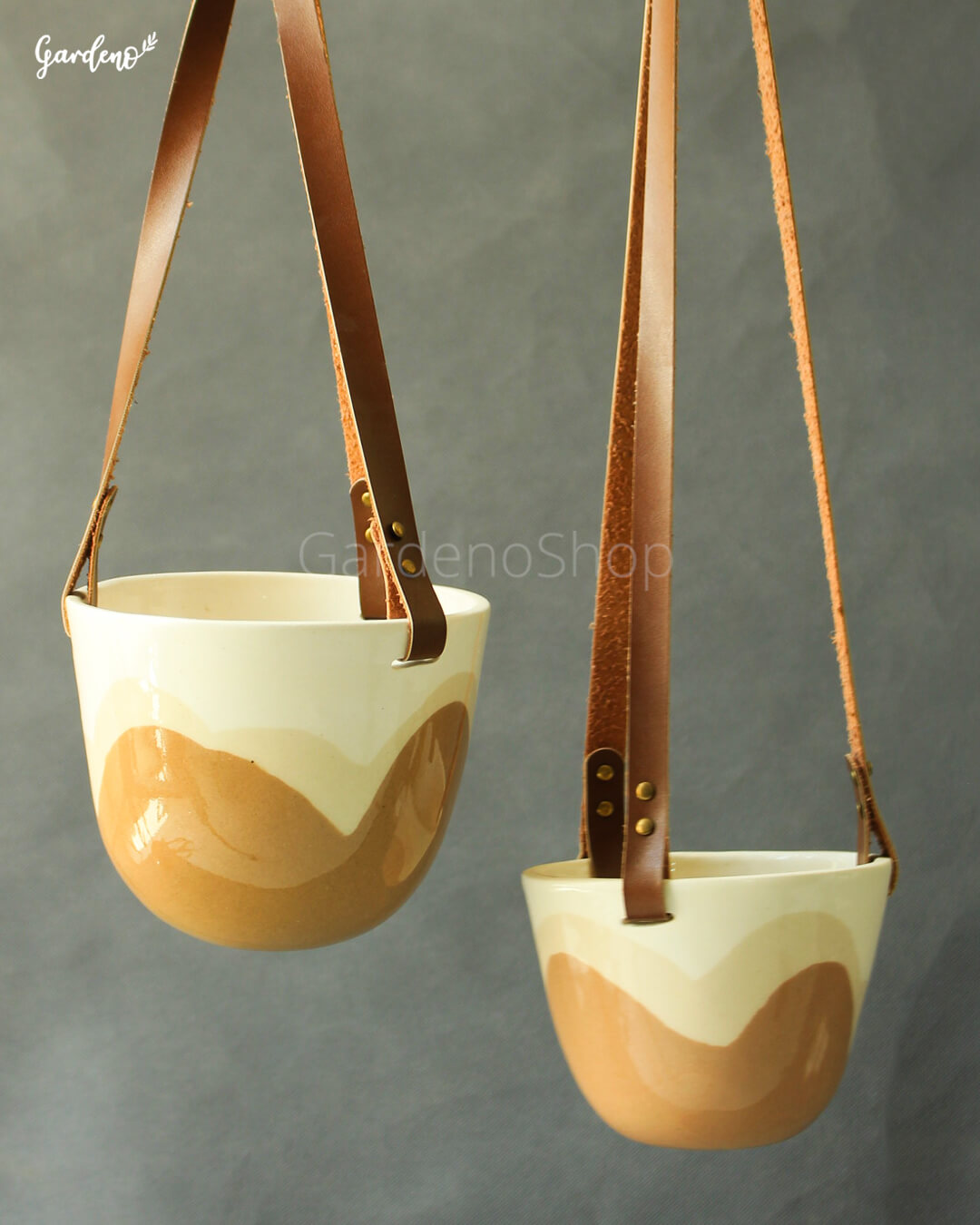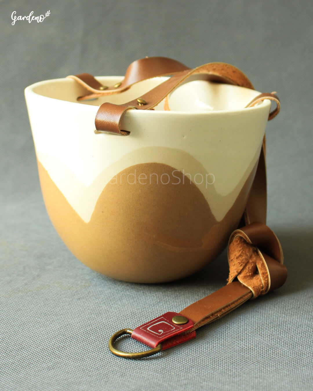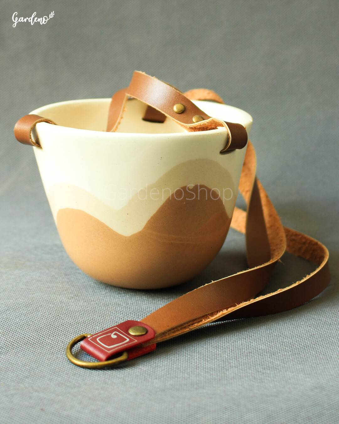 گلدان‌های آویز سرامیکی دارای بند چرم است که مقاومت بالایی از خود نشان می‌دهد و شما می‌توانید به راحتی گیاه خودتان را داخل آن بکارید. بند چرم در ارتفاع ۵۰-۵۵ سانتیمتر از لبه گلدان تا قسمت آویز است.